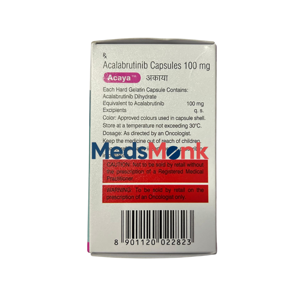Acaya 100 mg Capsule contains Acalabrutinib, a targeted anticancer medicine used to treat certain blood cancers. It helps slow cancer cell growth and disease progression under oncologist supervision.