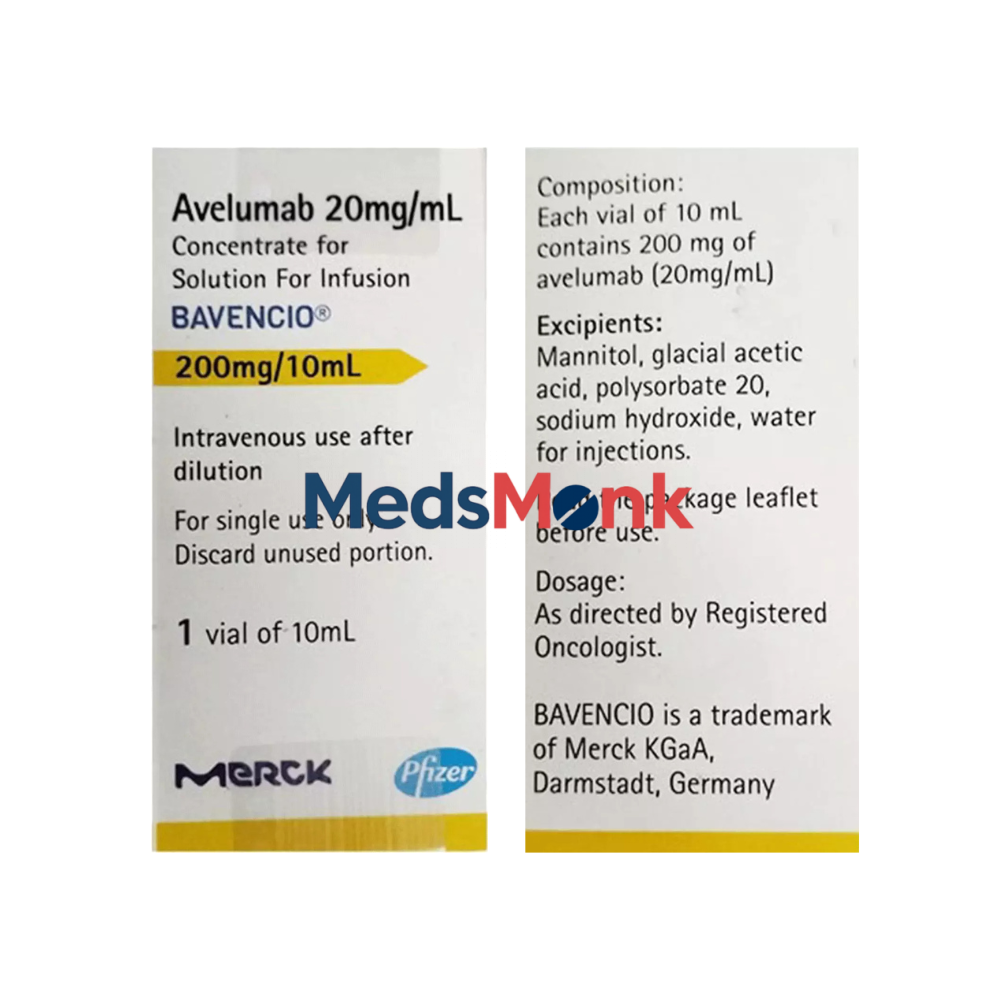 Bavencio 200 mg Injection contains Avelumab, an immunotherapy medicine used in the treatment of certain advanced cancers. It is a monoclonal antibody that enhances the body's immune response to identify and attack cancer cells. Bavencio is administered intravenously under the supervision of an oncologist in a medical facility.