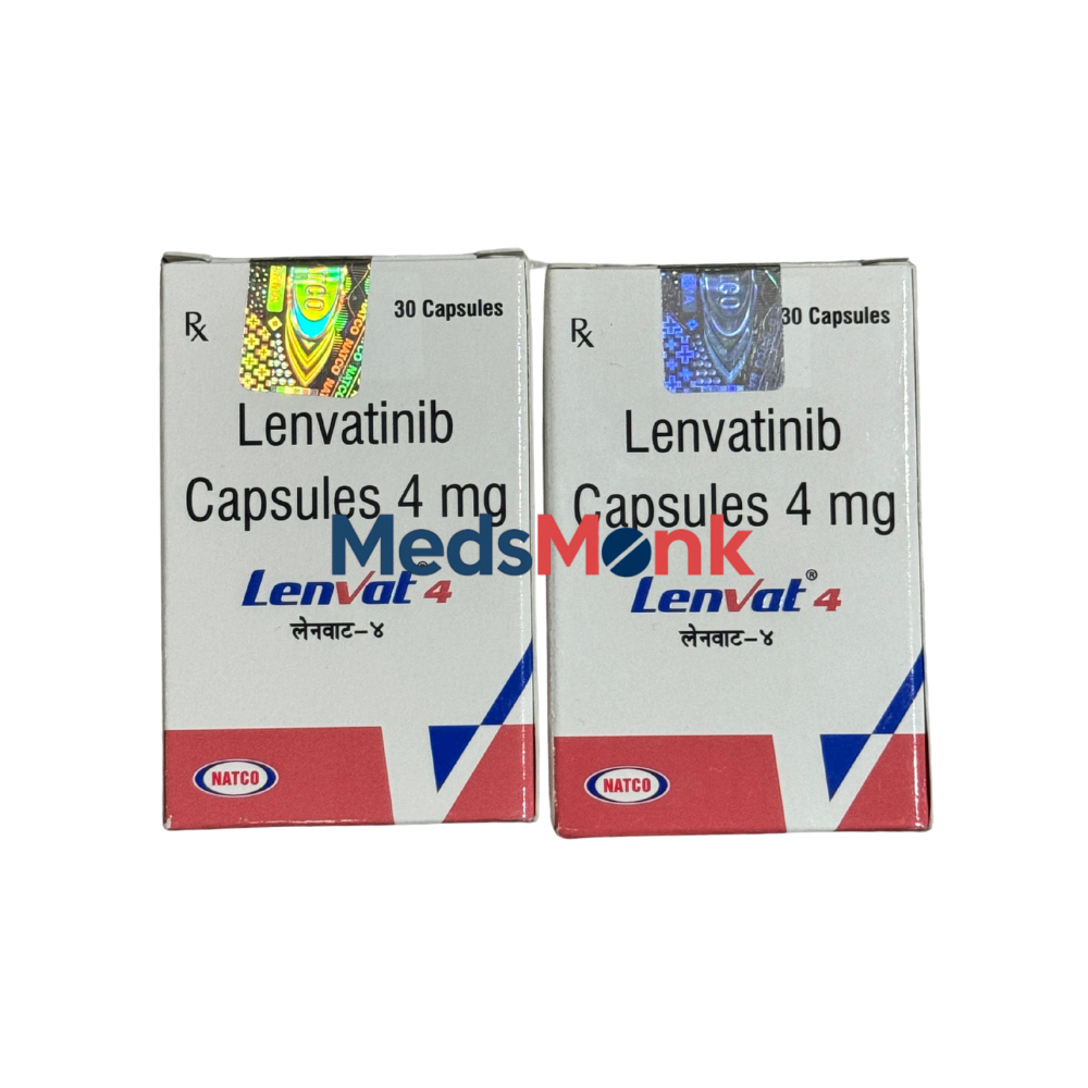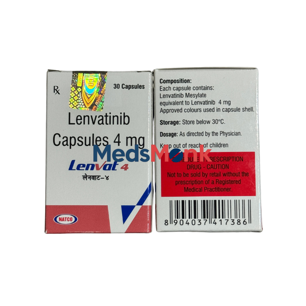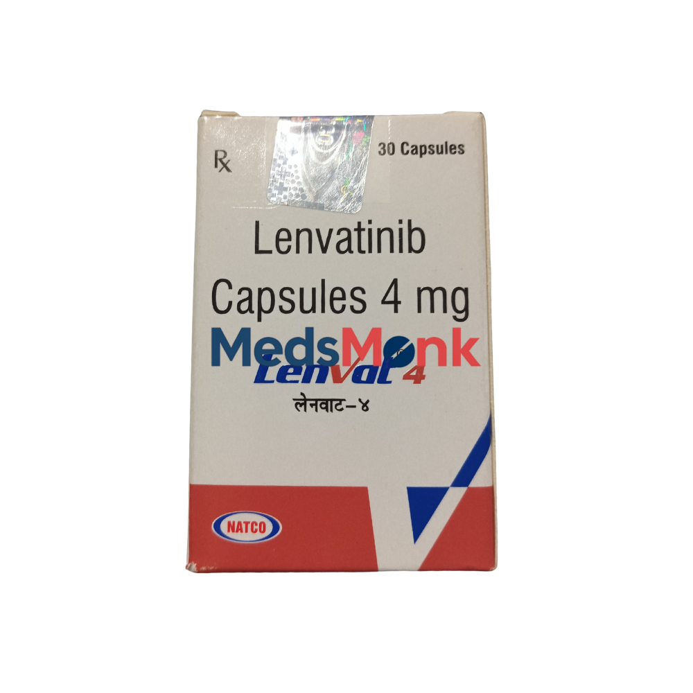Lenvat 4 mg Capsule is a prescription cancer medicine made by Natco Pharma Ltd. It contains the active ingredient lenvatinib, which belongs to a targeted treatment group called tyrosine kinase inhibitors (TKIs). Lenvatinib 4 mg Capsule treats thyroid, kidney, and liver cancer. Lenvatinib blocks specific proteins: VEGFR1, VEGFR2, VEGFR3, FGFR1, FGFR2, FGFR3, FGFR4, PDGFRα, RET, and KIT, which help cancer cells grow and make new blood vessels. Cancer cells use blood vessels to get food and oxygen. By stopping this process, Lenvat 4 mg slows or stops cancer growth, and may even help reduce tumor size. This medicine is only available with a doctor's prescription and should be taken exactly as your healthcare provider advises to ensure safety and effectiveness.